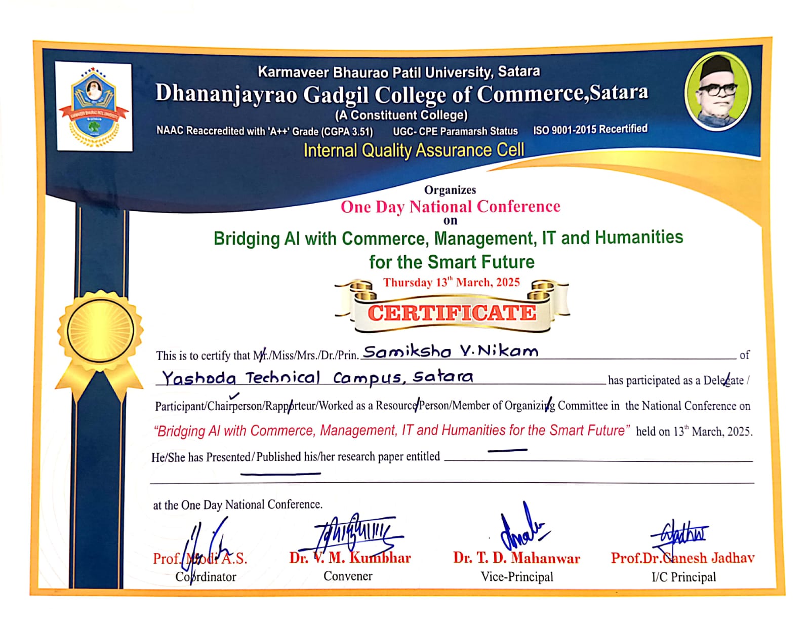 Miss Vaishnavi Vaman Gaikwad from Yashoda Technical Campus, Satara, participated in the One Day National Conference on "Bridging AI with Commerce, Management, IT, and Humanities for the Smart Future," organized by the Internal Quality Assurance Cell of Dhananjayrao Gadgil College of Commerce, Satara, under Karmaveer Bhaurao Patil University, Satara. The conference, held on March 13, 2025, was ISO 9001-2015 recertified and NAAC A++ accredited. She attended as a delegate and presented her research paper titled "Smart Agriculture: Detecting and Classifying Onion Diseases." The event was coordinated by Dr. V.M. Kumbhar, convened by Dr. T.D. Mahanwar, and overseen by Prof. Dr. Ganesh Jadhav, Vice-Principal/Principal.