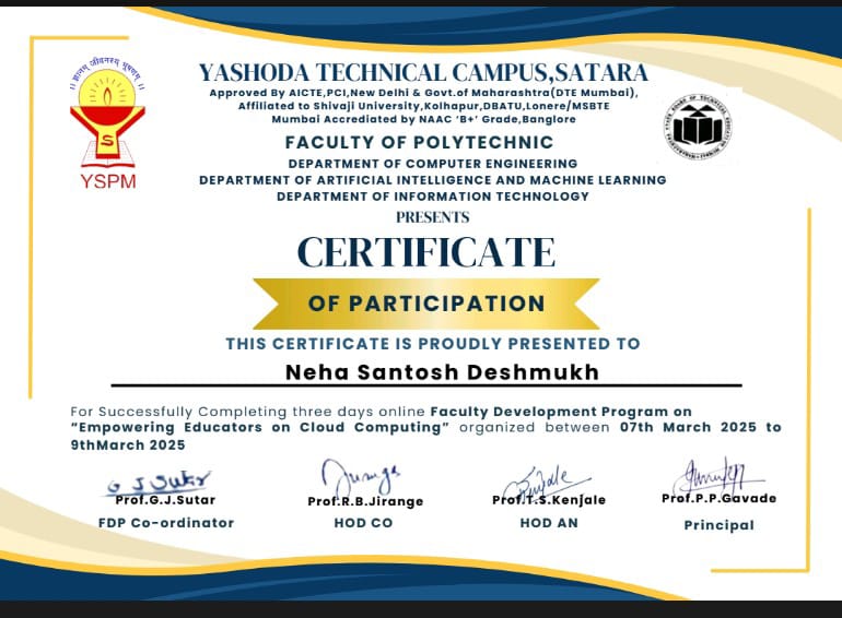 The certificate is issued by Yashoda Technical Campus, Satara, under the Faculty of Polytechnic, specifically from the Department of Computer Engineering, Artificial Intelligence & Machine Learning, and Information Technology. It is awarded to Neha Santosh Deshmukh for successfully completing a three-day online Faculty Development Program (FDP) on "Empowering Educators on Cloud Computing", which was organized from 7th March 2025 to 9th March 2025. The certificate acknowledges her participation and achievement in the program. It is officially signed by Prof. G. J. Sutar (FDP Coordinator), Prof. R. B. Jirange (HOD CO), Prof. T. S. Kenjale (HOD AN), and Prof. P. P. Gavade (Principal).