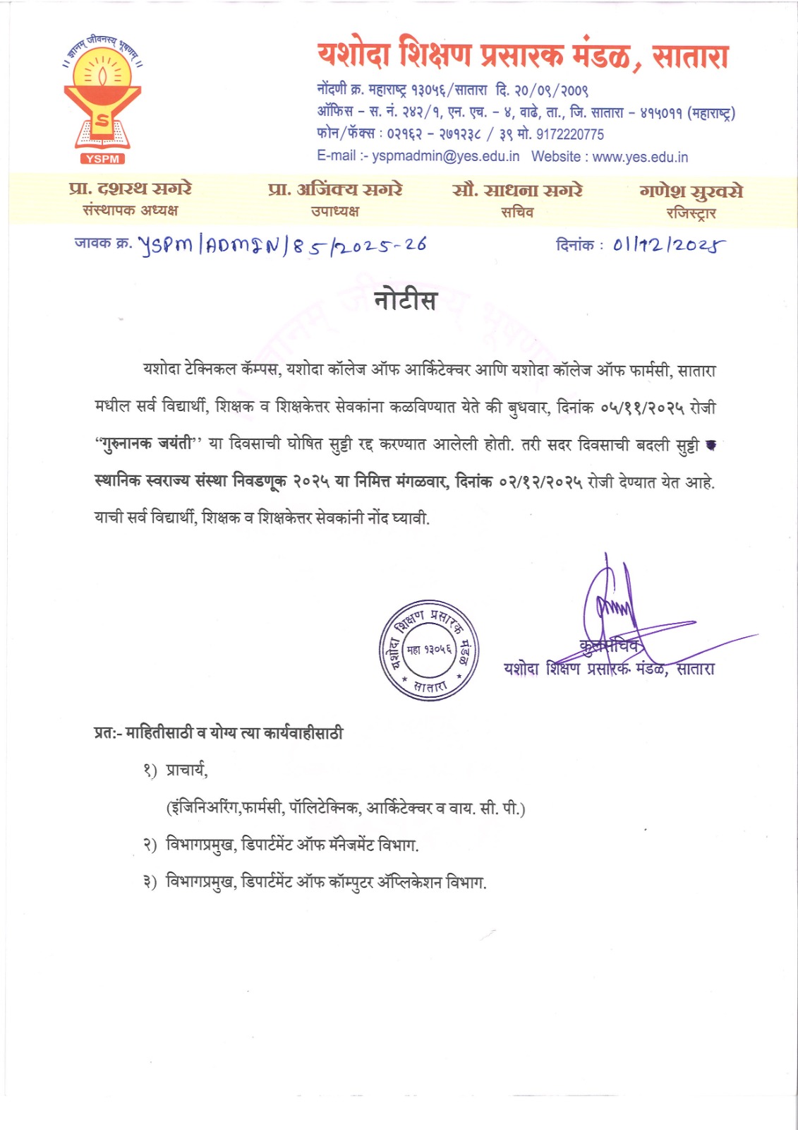 लेखी परीक्षा यशोदा टेक्निकल कॅम्पस इंजिनिअरींग अँड पॉलिटेक्निक, सातारा या विभागामध्ये होणार आहे त्याबाबत.. |