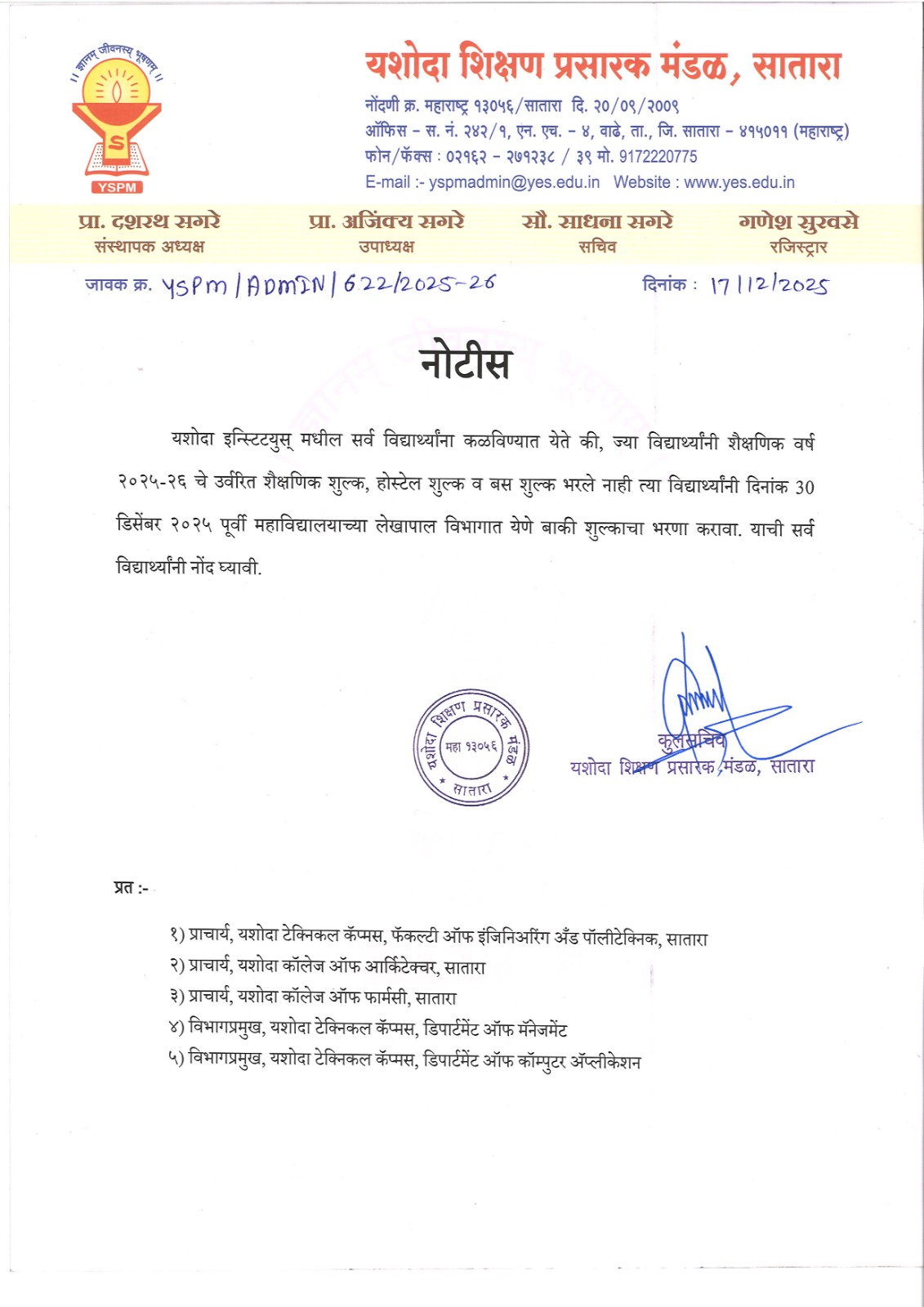 शैक्षणिक वर्ष २०२५-२६ चे उर्वरित शैक्षणिक शुल्क, हॉस्टेल शुल्क व बस शुल्क भरणे बाबत.. |